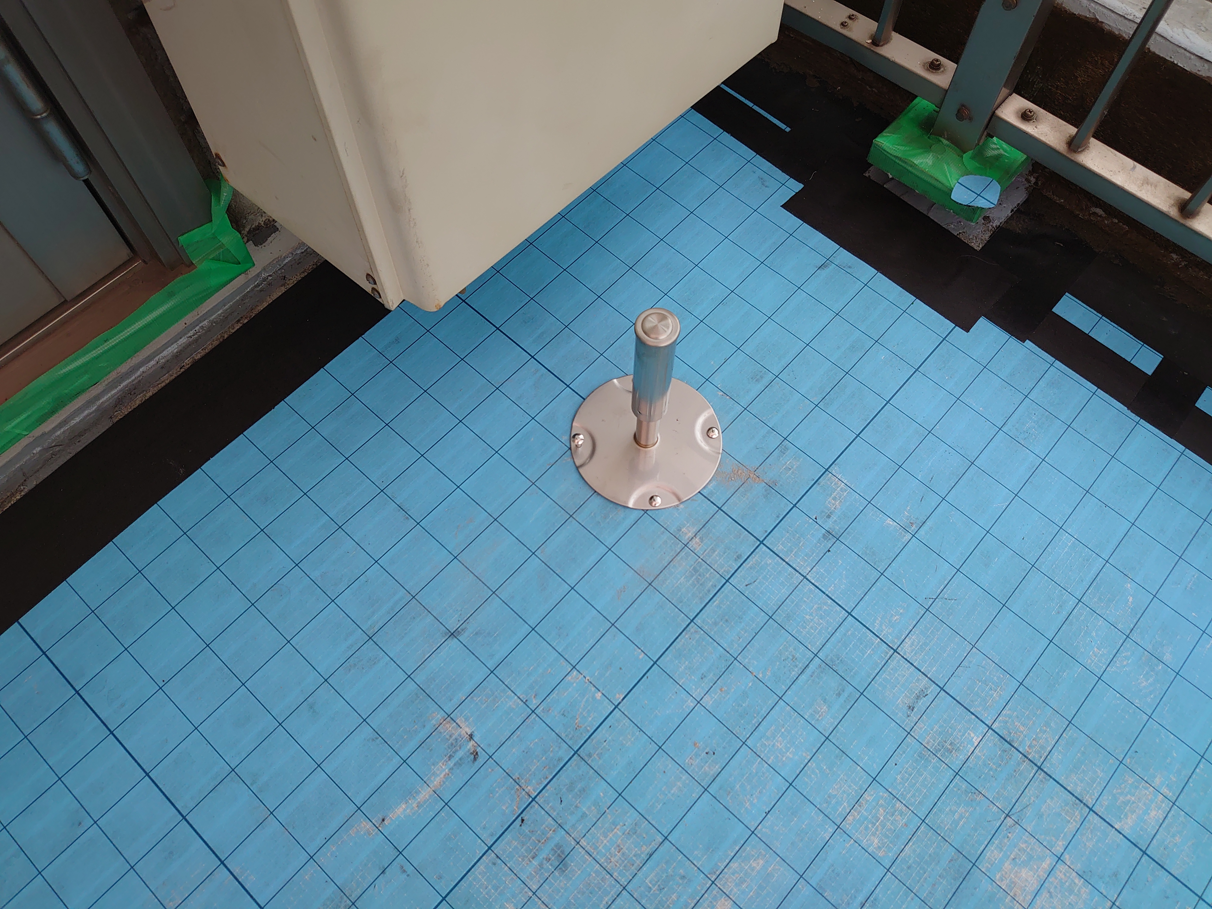 通気緩衝マット張り付け(防水層の下の水分を抜けやすくするための層をもった絶縁マットを張り付けていきます)